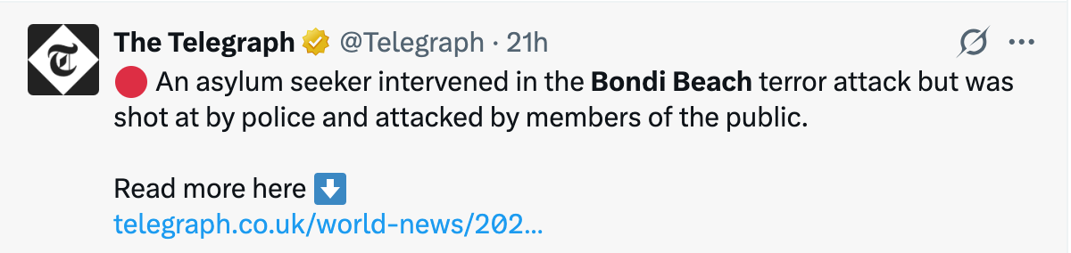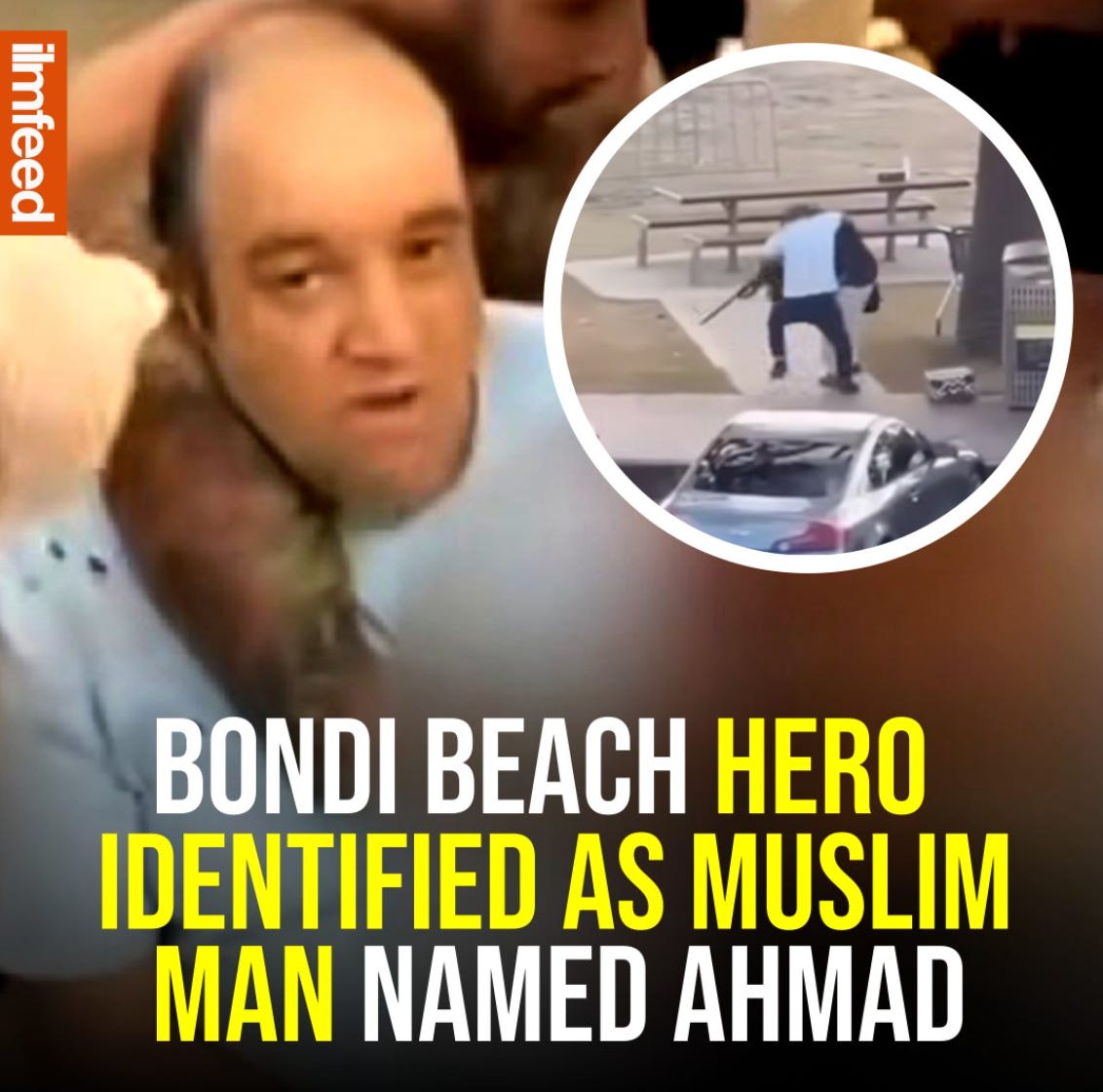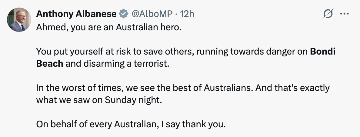 Seven News: “The gentleman who raced into the scene to disarm one of the gunmen we’re just learning some details about him because he has been shot now we are confident in saying that that is him…one of his relatives has just spoken to one of our reporters we’ve got an interview coming in. We understand that this gentleman’s name is Ahmed Al Ahmed, he’s a 43 year old married father of two..And he raced in to help. We understand apparently owns a fruit shop in Sutherland. No experience with guns. He was just walking past. We are told that he has two bullets in his arm, but they think he’s going to be okay. And in the next hour…let’s have a listen to the hero’s relatives talking about his axe this evening at Bondi Beach. ‘Still he’s in hospital and we don’t know exactly what’s going on inside, but they said, the doctor, is okay. And next two hours they let us to go in and see Ahmed, because he’s still inside, and he did the operation. But we hope he will be fine. He’s a hero, 100%. He’s a hero, because what we see on the social media, he’s 100% a hero. He has two shots, one in his arm here, and one in his hands’. ‘And have you been able to talk to him today?’ ‘No. No, because I come when I see what’s happening, and I come here to see him. But they said there’s not allowed to go inside because you have to make an operation whatever. I’m still waiting to see him’. Well there you go, some first-hand accounts.”