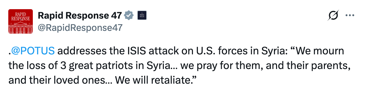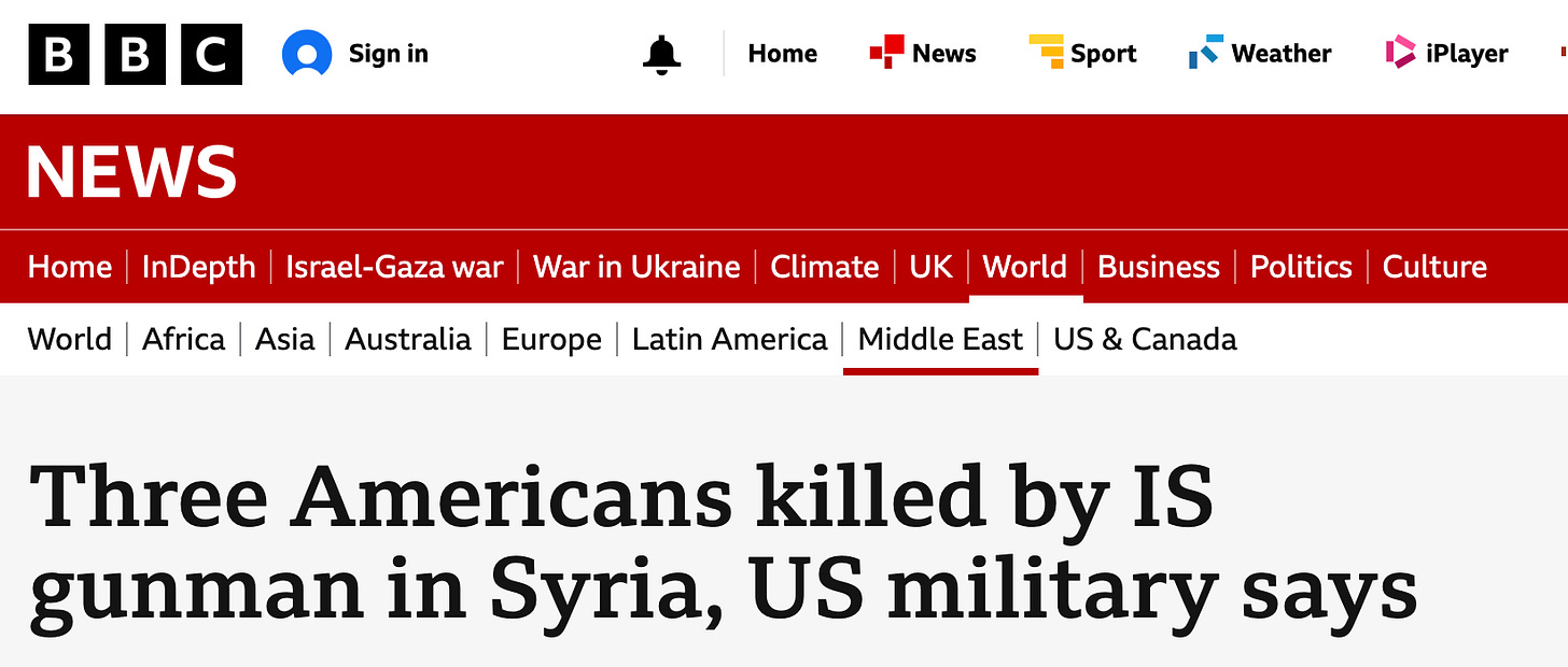 “Two US soldiers and a US civilian interpreter have been killed in Syria in an ambush by an Islamic State (IS) gunman, the US Central Command (Centcom) has said. Officials said three other service members were injured in the attack, during which the gunman was ‘engaged and killed’. Syria’s state news said two Syrian service personnel were also injured. US President Donald Trump wrote on social media that it was ‘an ISIS attack’ against the US and Syria and said there would be ‘a very serious retaliation’. Syria’s president sent condolences to Trump after the attack.”