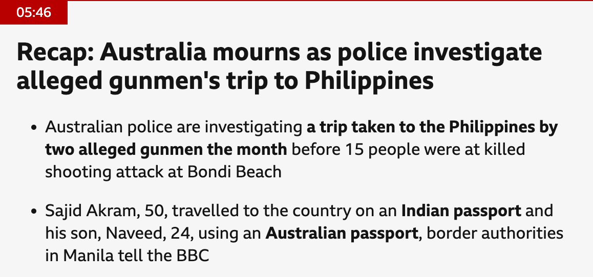 “Last month, both suspected attackers underwent military-style training in the southern Philippines. Authorities in Manila confirmed on Tuesday that they entered the country on November 1, with the southern province of Davao listed as their final destination. Sajid Akram entered as an ‘Indian national’. Dana Sandoval, an immigration spokeswoman, said: ‘Sajid Akram, 50, Indian national, and Naveed Akram, 24, Australian national, arrived in the Philippines together last November 1, 2025 from Sydney, Australia. Both reported Davao as their final destination. They left the country on November 28, 2025 on a connecting flight from Davao to Manila, with Sydney as their final destination’.”