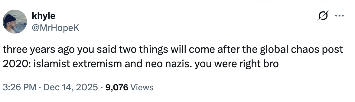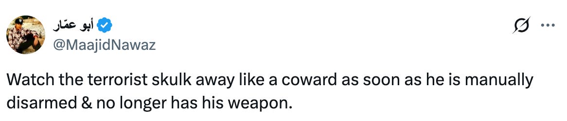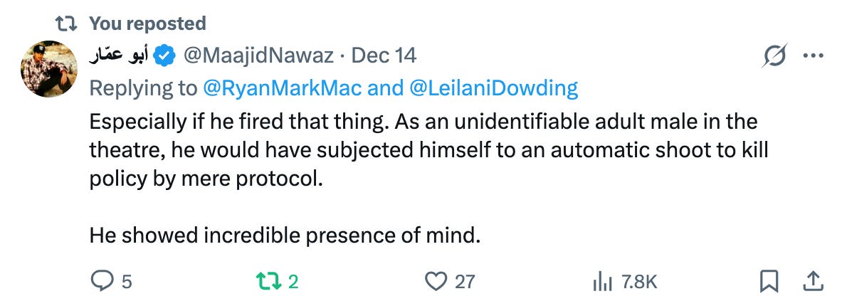 Maajid Nawaz for WARRIOR CREED: “But it was incredibly poetic for the man that stopped these ISIS attackers in Bondi Beach to be Syrian himself. That’s something that would resonate with his country, with everybody in Syria. They would be very proud that he stopped an ISIS attacker in Australia, just as they stopped ISIS in their tracks in Syria from forming their so-called Islamic State. Of course, that is in itself a misnomer. And so that’s important. And it’s important for our Jewish cousins to also be aware of that so that they don’t feel intimidated by every single Muslim, because of course there are multiple times more Muslims around the world in terms of numbers than there are Jews. So it’s understandable that our Jewish cousins would be scared and feel under siege, if it were true that all Muslims think like ISIS or even a less extreme version of ISIS. But the fact is they don’t. Because there are Muslims, our brother like Ahmad al-Ahmed, who are prepared - and this is the key point here - to take a bullet to protect Jewish lives. Ahmad al-Ahmed, the Syrian Muslim, took bullets to his body to protect Jewish lives on Bondi Beach. That is the truth of the matter. And that is what everybody needs to hear. And that is that Muslims are prepared, and do regularly stand in between jihadist terrorists and their intended targets and victims. In this case Jews. In other cases, they could be anybody else. They are usually unsung heroes because they’re not so prominently placed in front of cameras while doing it, as was the case here.”