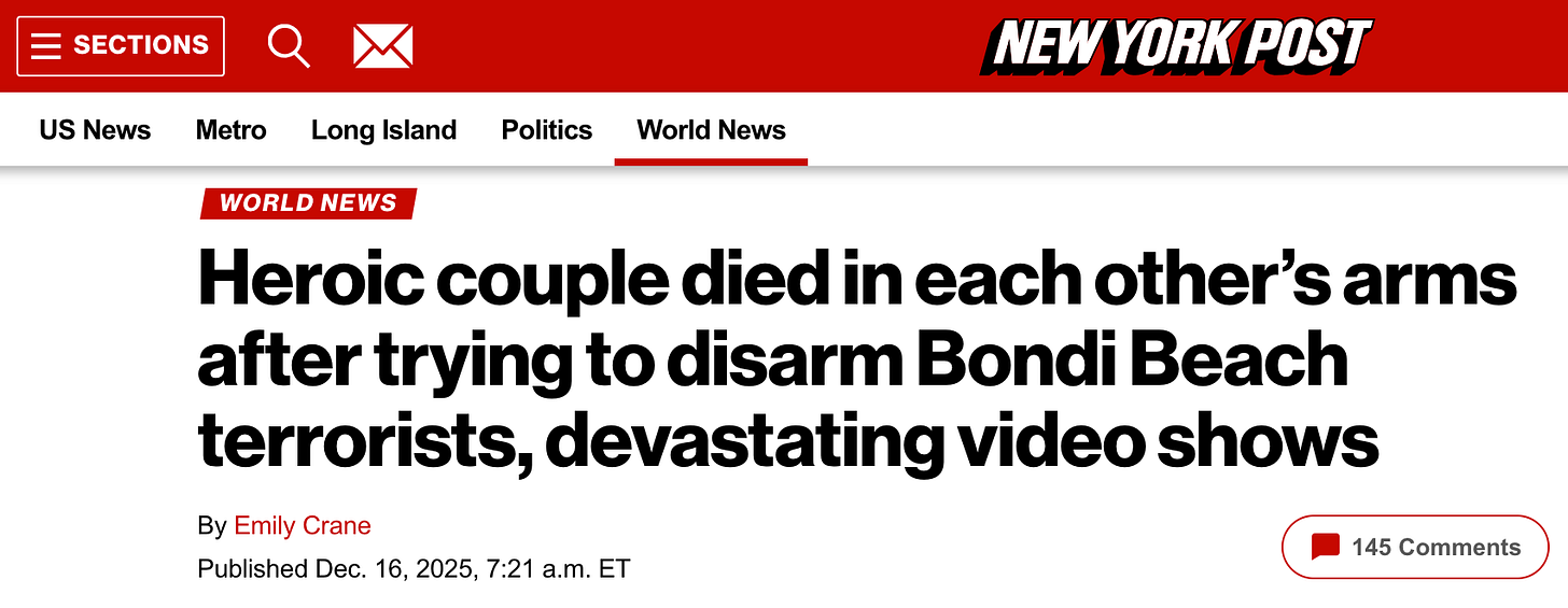 “Harrowing video shows an Australian couple heroically trying to take down one of the Bondi Beach terrorists — before both were shot and left to die in each other’s arms just weeks before the 35th wedding anniversary. Boris Gurman, 69, and his 61-year-old wife, Sofia, tried to thwart one of the gunmen after they spotted the rifle-toting terrorist emerging from a car draped with a homemade ISIS flag before the deadly rampage began on Sunday, the Sydney Morning Herald reported.”