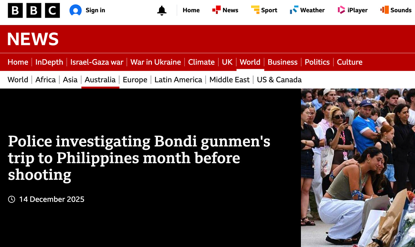 With the training in the Philippines, and after these recent ISIS attacks in Syria kept in mind, Bondi Beach immediately takes on a dimension of international terrorism. This is serious.