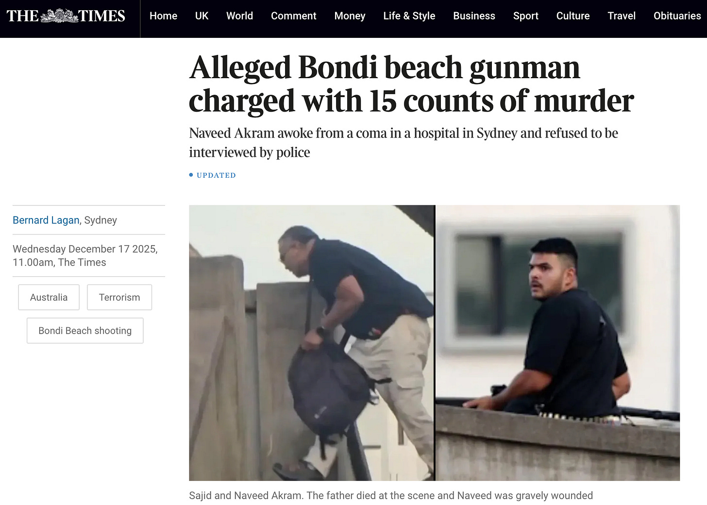“The surviving suspect in the Bondi beach massacre has been charged with 15 counts of murder in his hospital bed after waking from a coma. Naveed Akram, 24, refused to be interviewed by Sydney police on Wednesday before he was charged with the murders of 15 Jewish festival goers, alongside his father, Sajid Akram, 50, in a terrorist attack on Sunday. His father was shot dead by police at the scene…He has been charged with 44 other offences, including 40 counts of wounding with intent to murder. He has also been charged in relation to displaying a prohibited terrorist symbol, an Islamic State flag, on his car and one count of placing an explosive in or near a building with intent to cause harm.”