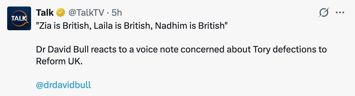 David Bull: “Can I just make the point: they are British. So, Zia is British. Leila is British. Nadhim is British. So I don’t buy that in any sense. Look, the whole point is that anyone who comes to our party has to subscribe to our values. If they don’t believe, and if they’re not on the same page as me and Nigel and the rest of us, then they are not welcome in the party. And it’s simple as that.”