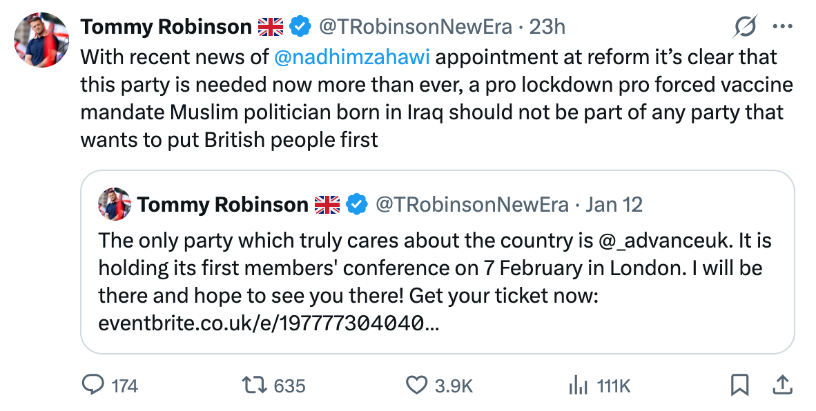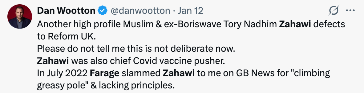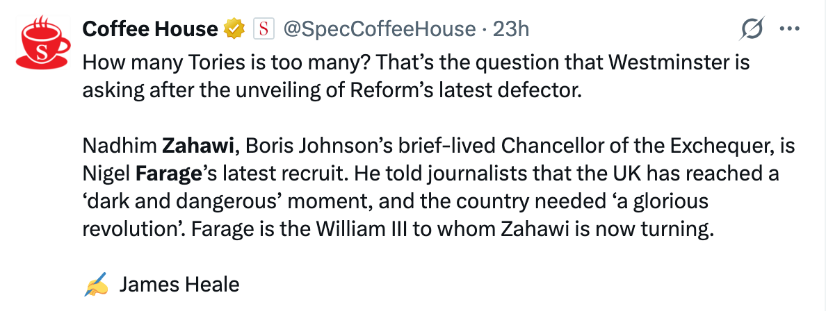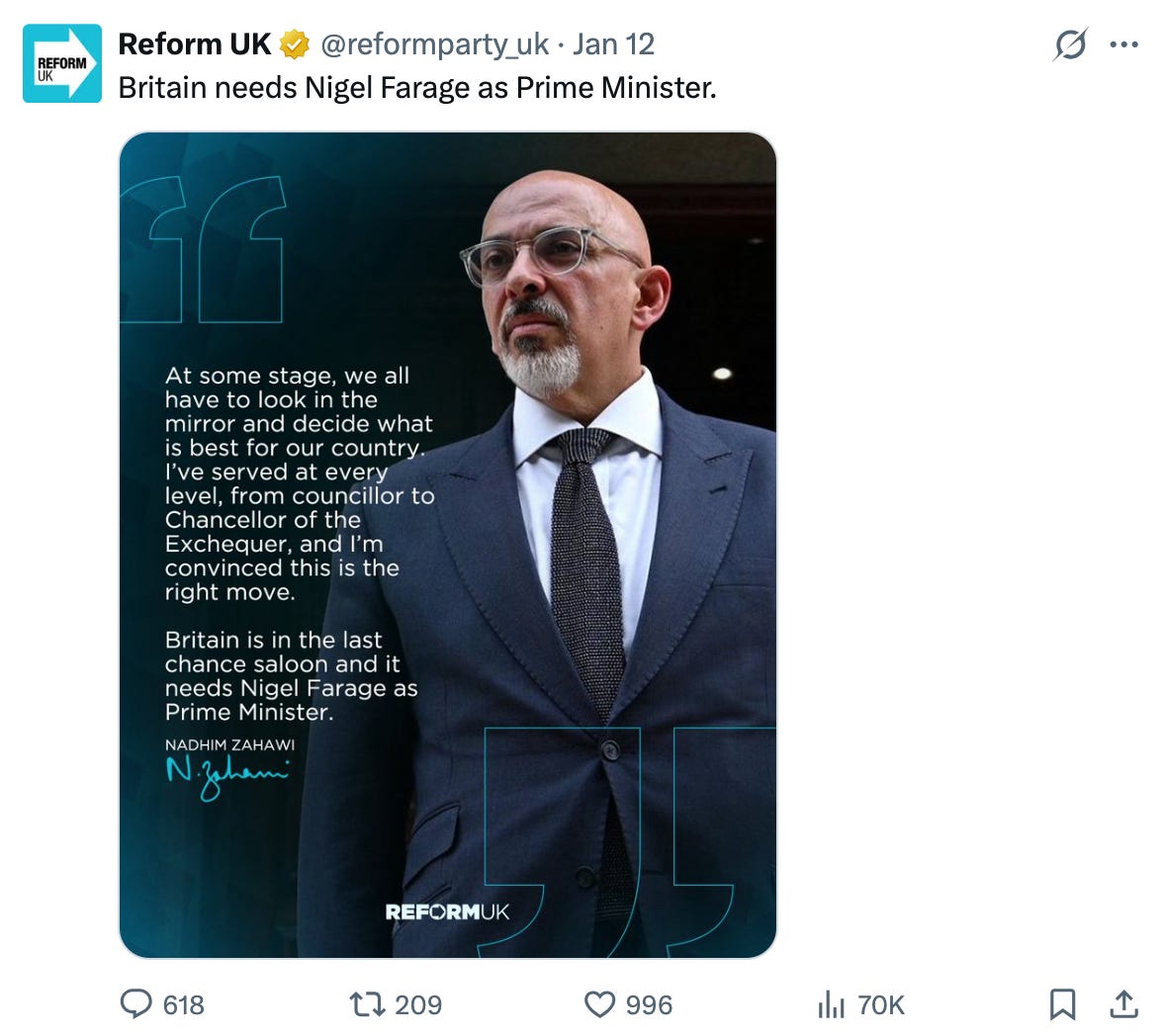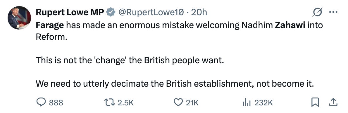 Many online populist-right commentators expressed dismay that Zahawi would dilute the Reform brand, instead symbolising a blurring of the lines between the old rejected Tories, and the new Reform, asking: how many Tories is too many?