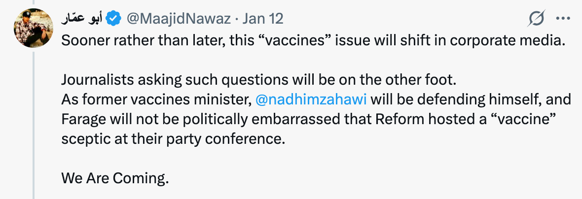 Regardless, the reality is that former ‘vaccines’ minister during Covid Nadhim Zahawi, has joined the only party whose leader has publicly linked ‘vaccines’ to excess death on our national airwaves.
