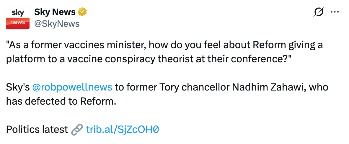 Journalist: “As a former vaccines minister how do you feel about Reform giving a platform to a vaccine conspiracy theorist at their conference this year.”