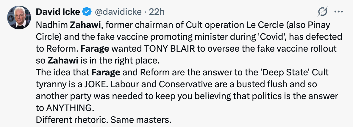 Perhaps the most persistently negative online commentator, David Icke went further by claiming that Farage is merely window dressing for the same globalists he opposes.