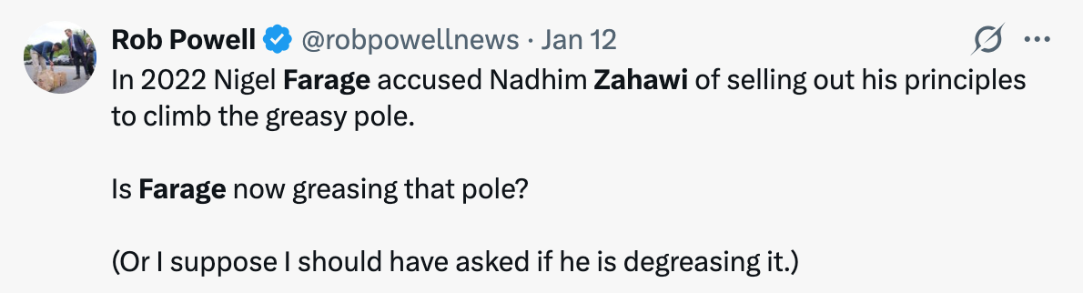 Journalist: “Okay, well if Mr Zahawi wanted to answer that. And also, tell me… what would you say to colleagues that you worked with in the Conservative government during the pandemic who might feel a little betrayed today. And Mr Farage, if I may as well, in 2022 when Nadhim Zahawi was appointed Chancellor, you said: ‘I thought Zahawi had principles but tonight we learned all he’s interested in is climbing that greasy poll’. Are you now greasing that poll for your new colleague?”