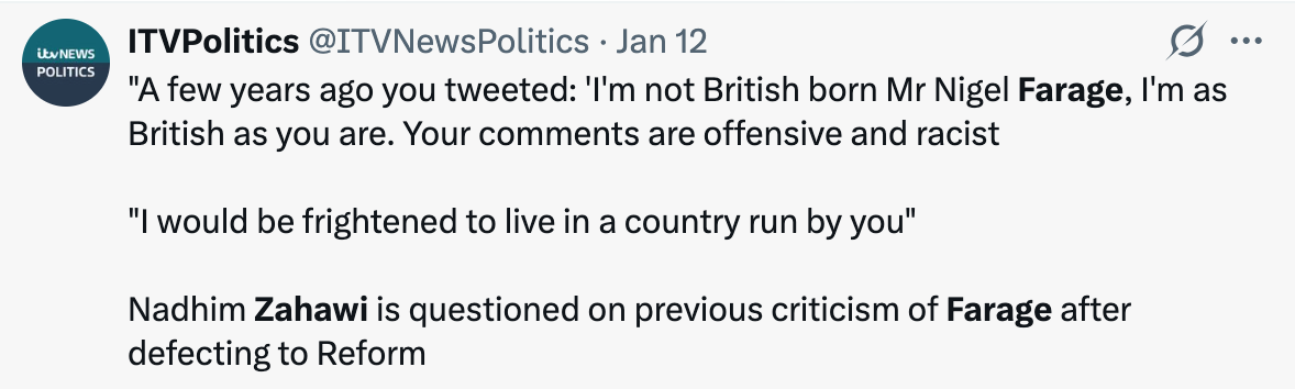 Journalist: “Nadhime Zahawi, a few years ago you tweeted: ‘I’m not British-born, Mr Nigel Farage. I am as British as you are. Your comments are offensive and racist. I would be frightened to live in a country run by you’. Why the change of heart? And this was 2015.”