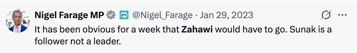 Many seem to have overlooked the fact that Farage opposed Zahawi when it actually mattered, when Zahawi was serving as the Tory Chancellor in 2023.
